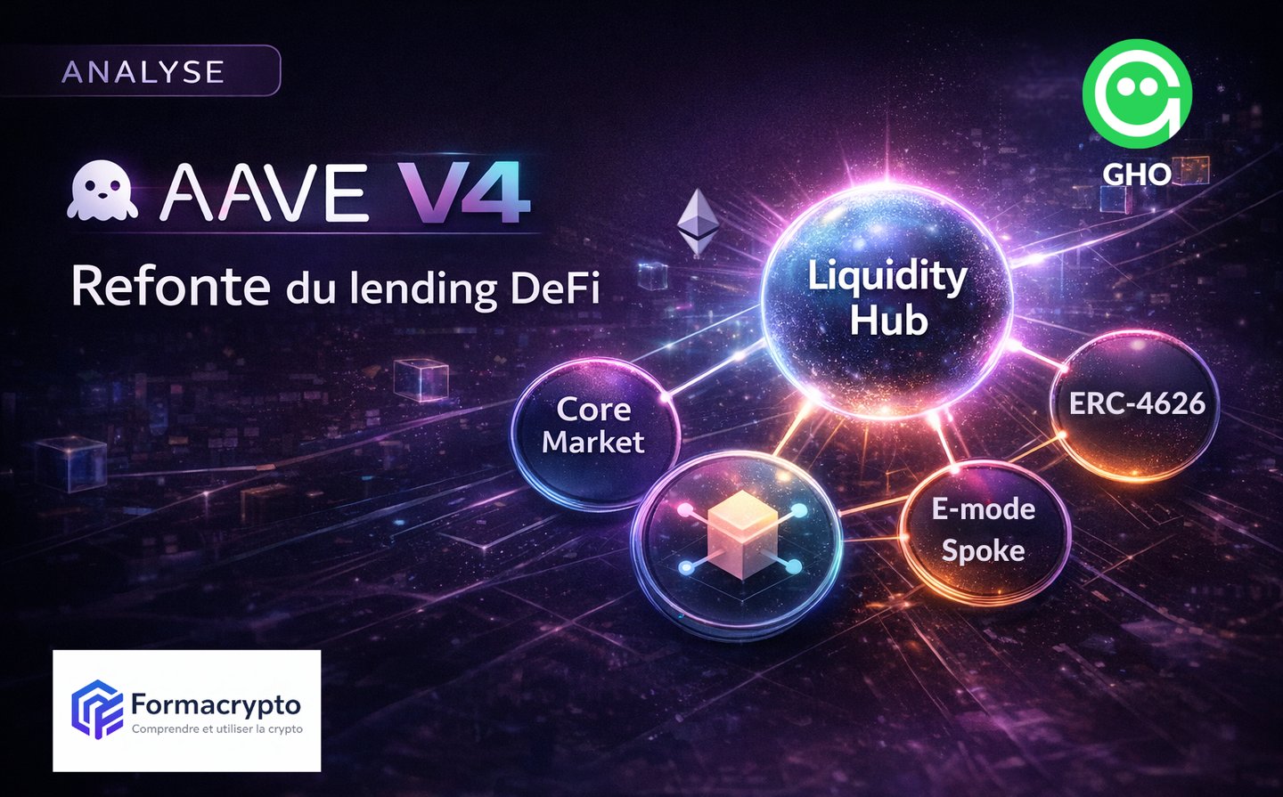 Le 30 mars 2026, Aave a déployé sa quatrième version sur le mainnet Ethereum, au terme de plus de deux ans de développement et de 345 jours cumulés d'audits de sécurité. Pour un protocole qui agrège aujourd'hui environ 23,8 milliards de dollars de TVL et détient entre 60 et 67% du marché du lending décentralisé, une mise à jour de cette ampleur ne se résume pas à quelques nouvelles fonctionnalités : elle redessine l'architecture de fond en comble, en réorganisant la façon dont la liquidité est stockée, distribuée et mise à disposition des différents marchés. Si vous utilisez Aave V3 régulièrement, comprendre cette refonte vous aidera à saisir pourquoi les conditions d'emprunt et de dépôt vont progressivement évoluer, et ce que les nouveaux marchés qui apparaîtront dans les prochains mois rendent possible.