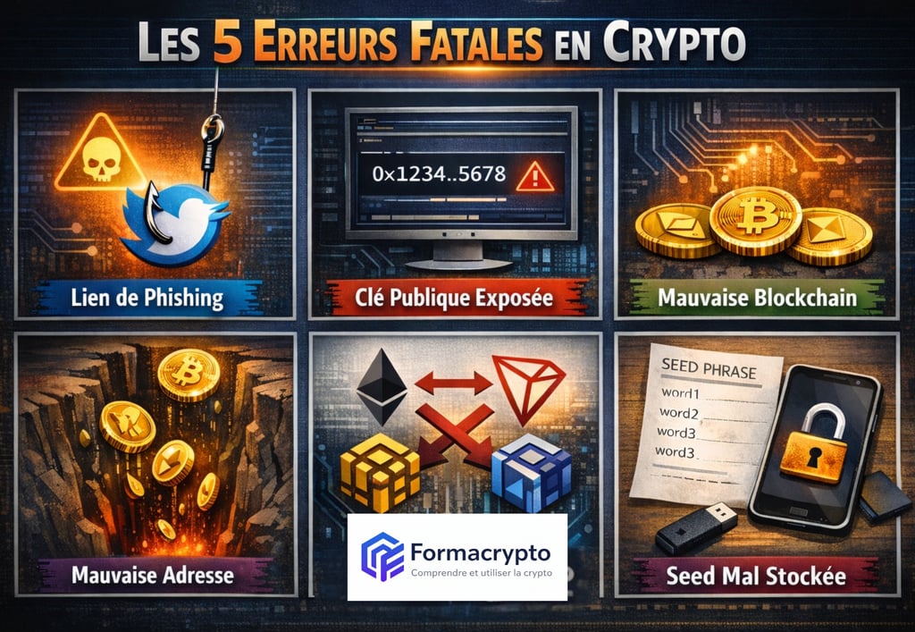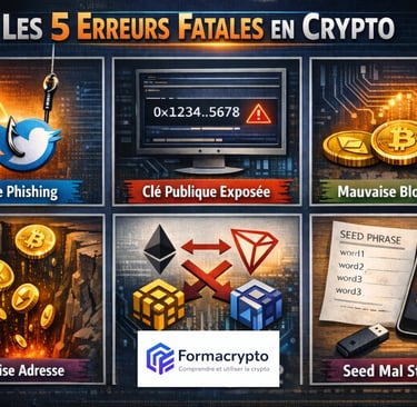 Phishing, mauvais réseau, seed phrase exposée... Découvrez les 5 erreurs fatales que j'ai vues en accompagnement crypto et qui ont coûté des milliers d'euros.