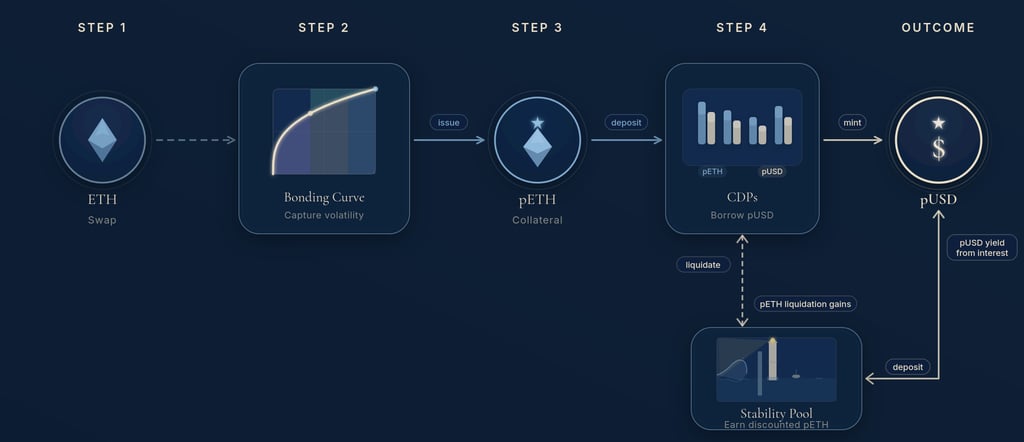 Le résultat pratique est remarquablement élégant : bien que le rendement final soit versé en pUSD, cette stratégie vise à minimiser l'exposition au prix (minimising price exposure) plutôt qu'à la supprimer de façon absolue. En effet, la valeur exacte du rendement dépendra de l'efficacité du swap automatique du pETH vers le pUSD au moment précis de la liquidation. Pour l'utilisateur, cela revient à conserver une exposition quasi-totale au dollar tout en capturant le yield des intérêts d'emprunt...