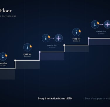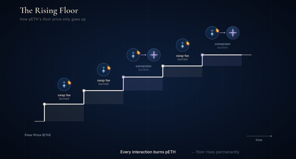 Le mécanisme va encore plus loin car en réalité, le floor monte à chaque interaction sur la bonding curve, incluant les dépôts (ETH → pETH) mais aussi les retraits (pETH → ETH). Chaque swap génère ainsi des frais en pETH qui sont immédiatement brûlés, raréfiant l'offre et augmentant la valeur du floor pour les jetons restants.