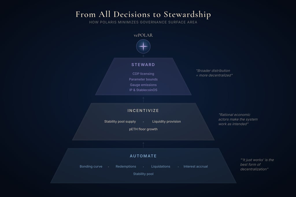 Par exemple concret, les stewards qui sont les holders de vePOLAR (POLAR verrouillé pour obtenir le pouvoir de vote) peuvent ajuster les taux d'intérêt d'emprunt dans une fourchette prédéfinie, disons entre 2% et 8% annuels, mais ils ne peuvent catégoriquement pas les mettre à 50% ni à 0% car ces valeurs sortent des bornes codées en dur. Ils peuvent ajuster les fees de la bonding curve dans une certaine range autorisée, mais pas les supprimer complètement ni les mettre à un niveau confiscatoire de 100%. Ils peuvent voter pour diriger les incentives POLAR vers tel ou tel pool de liquidité spécifique pour stimuler sa croissance. Ils peuvent définir la part exacte des intérêts d'emprunt qui est redistribuée à la Stability Pool, mais uniquement dans des limites codées en dur garantissant un minimum pour que la pool reste toujours suffisamment approvisionnée.